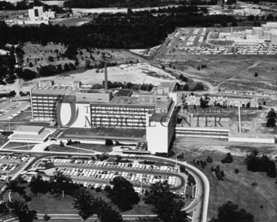 Aerial view of the full campus of the University of Mississippi Medical Center in the mid 1960s after the addition of the Research Wing and School of Nursing