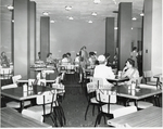 Black and white photograph of people sitting in the original cafeteria