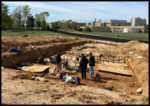 Color photograph of the excavation and the professional crew of the Asylum Hill cemetery