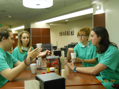 Color photograph of Frate Fellowship students. The Frate Fellowship is a structured five-week immersion experience on the University of Mississippi Medical Center campus in Jackson designed to give undergraduate students in the humanities a substantive exposure to the broad spectrum of ethical, social, and cultural issues associated with modern health care. The fellowship is named in honor of the late Dr. Dennis A. Frate, a medical anthropologist who examined health and health care by way of the human factors that determine how we experience illness, injury, and their treatment, and whose work was strongly informed by the humanities.
