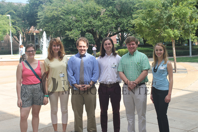 Color photograph of Frate Fellowship students. The Frate Fellowship is a structured five-week immersion experience on the University of Mississippi Medical Center campus in Jackson designed to give undergraduate students in the humanities a substantive exposure to the broad spectrum of ethical, social, and cultural issues associated with modern health care. The fellowship is named in honor of the late Dr. Dennis A. Frate, a medical anthropologist who examined health and health care by way of the human factors that determine how we experience illness, injury, and their treatment, and whose work was strongly informed by the humanities