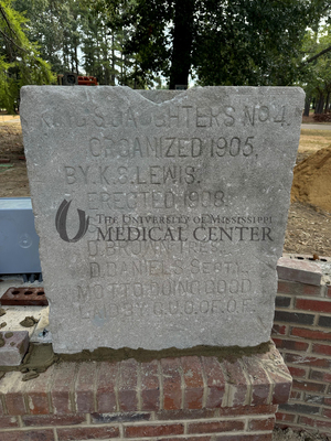 Cornerstone from African American King's Daughters Hospital in Yazoo City prior to it's installation at the Mississippi State Medical Association plaza